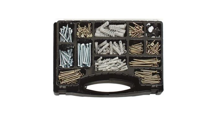 Compleet assortiment houtschroeven en pluggen in overzichtelijke bewaardoos, 620-delig.