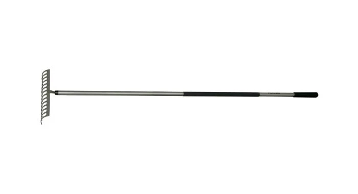 Brede hark voor het samenharken van bladeren, gras en tuinafval op het gazon.