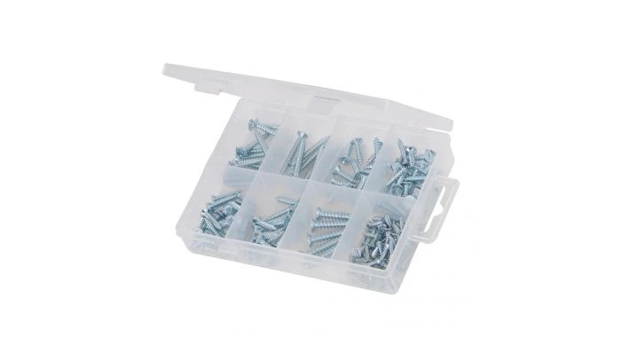 Zink geplateerd voor roestweerstand. Zelftappende Pozidriv schroeven met cilinderkop. Inclusief metrische maten: 3 x 12, 3,5 x 16, 3,5 x 19, 4 x 16, 4 x 19, 4 x 25, 4 x 30 en 5 x 30 mm. Handige gevakte opbergkoffer.