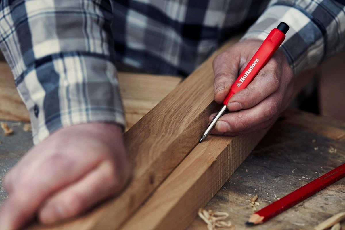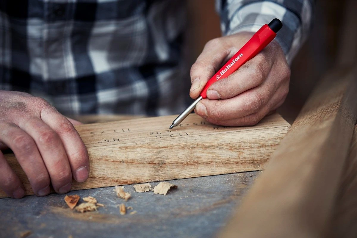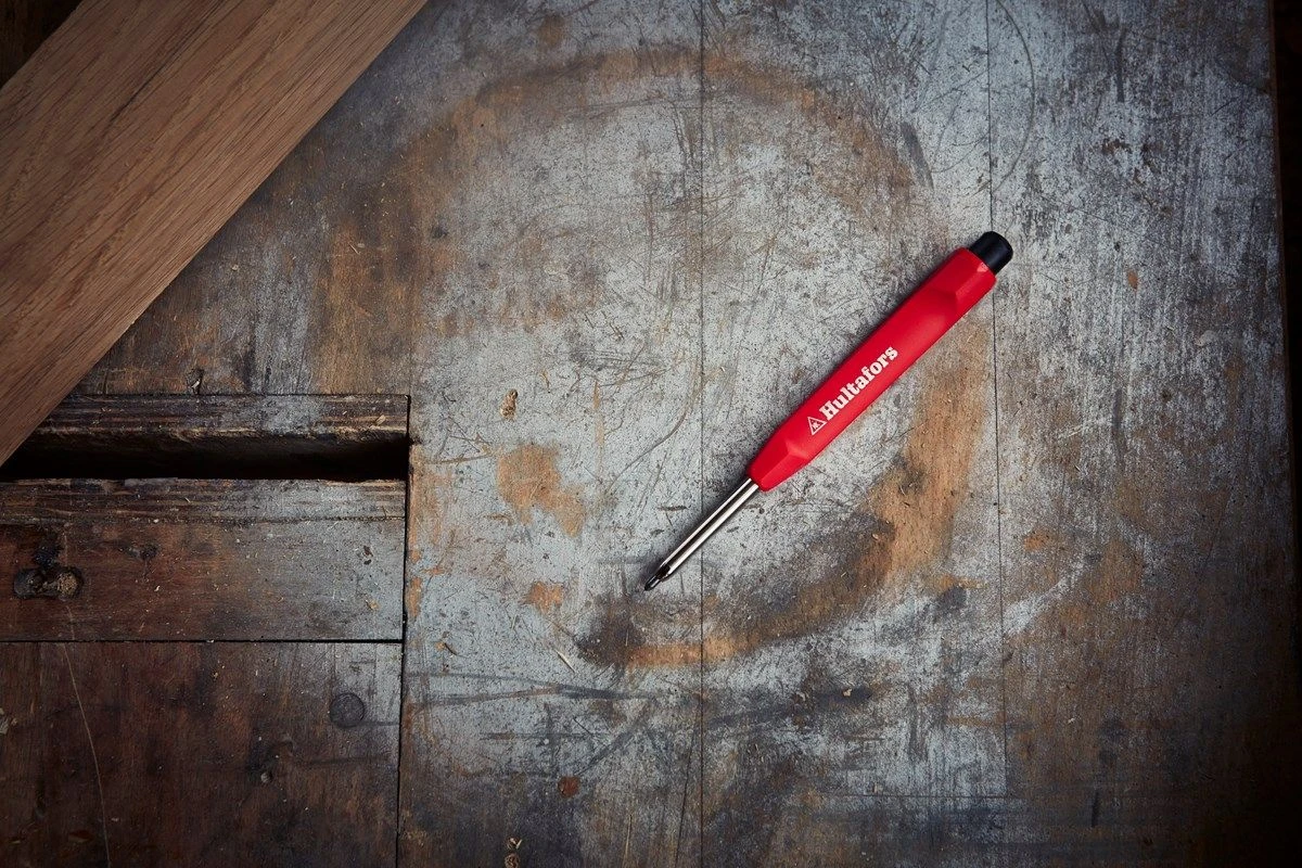 Handzaam Hultafors vulpotlood in houder met ingebouwde puntenslijper om zuiver af te tekenen.
