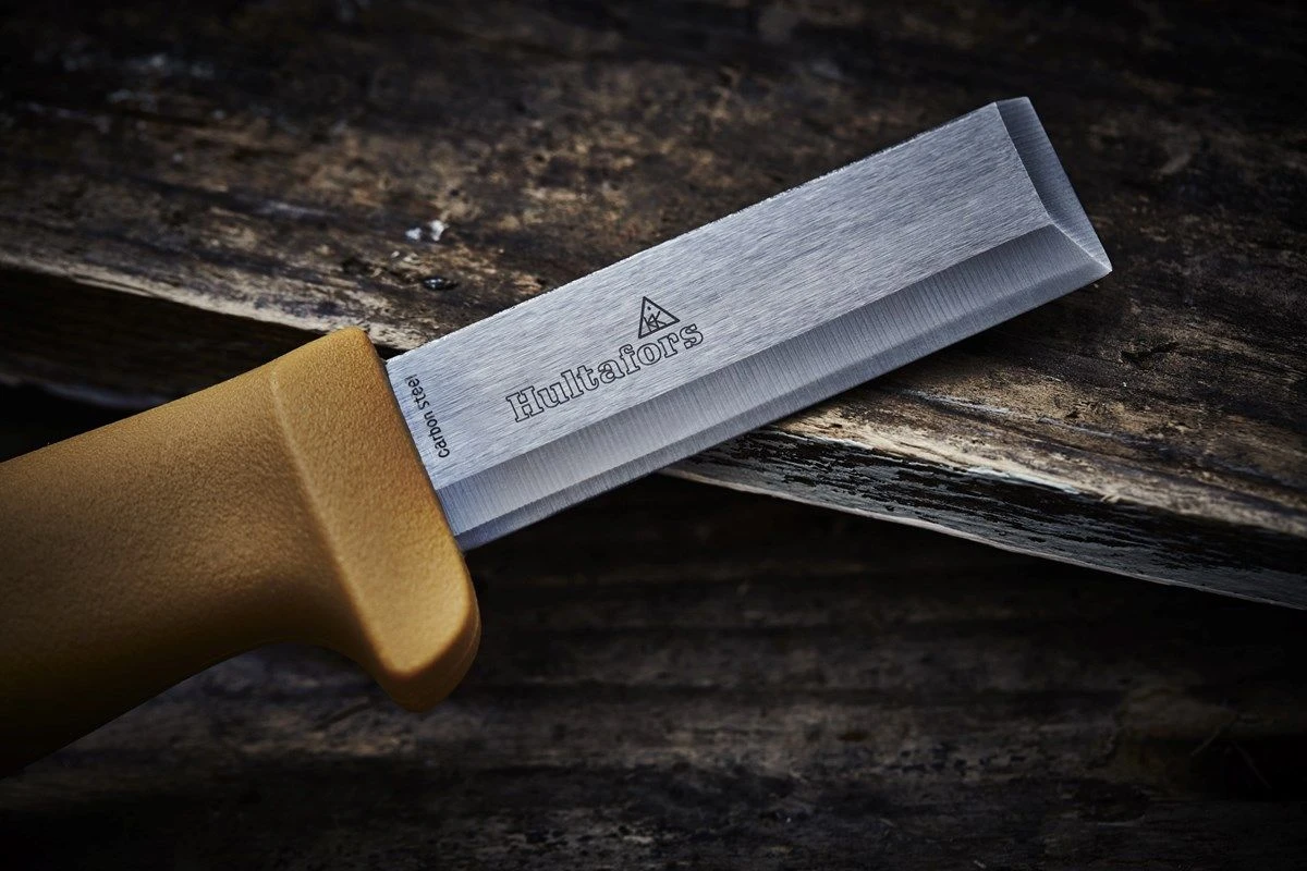 Robuust mes met v-vormige beitelfunctie. Het heeft een unieke functie om het holster rond een knoop op uw werkkleding te bevestigen, zodat het niet losraakt en het toch makkelijk te verwijderen is. Het lemmet is gemaakt van Japans messenstaal, 3 mm carbonstaal, dat is gehard tot 58–60 HRC.