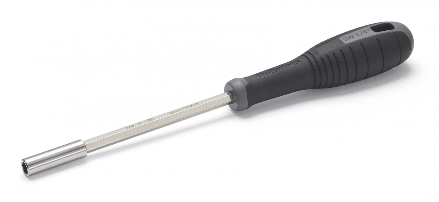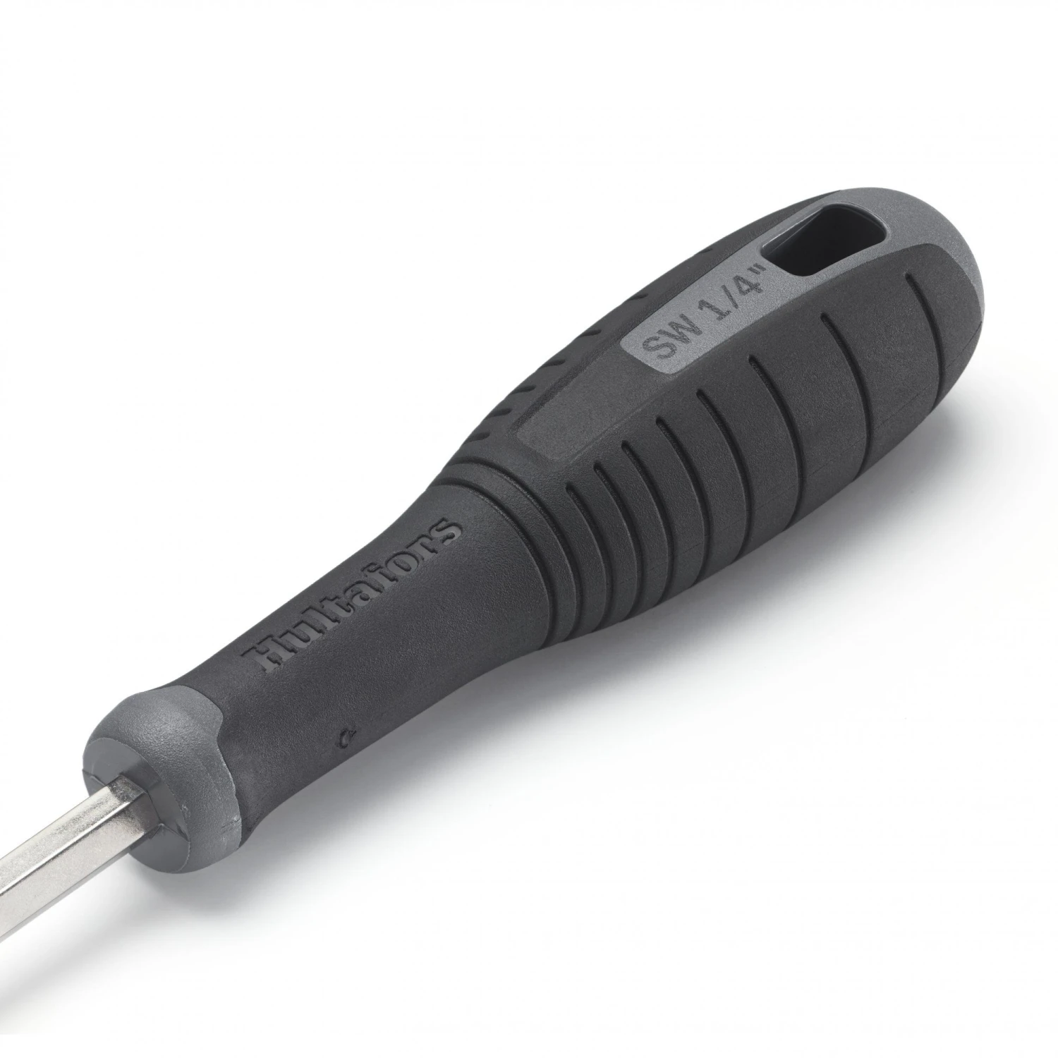 De handgreep van de bitschroevendraaier heeft een gat om op te hangen of vast te zetten. Het ontwerp van de handgreep voorkomt dat de schroevendraaier over hellende oppervlakken rolt.