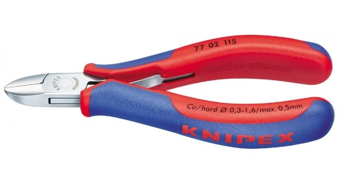 Precisietangen om zeer fijn te knippen bijv. in elektronica en fijnmechanica. Doorgestoken precisiescharnier. Soepele, dubbele veer, waardoor de tang gemakkelijk en gelijkmatig opent. De polijsting of spiegelpolijsting (alleen uitvoering 2) biedt samen met een fijne oliefilm een optimale bescherming tegen roest – geen storingen in het schakelcircuit door wegspringende chroomsplinters. Snijkanten extra inductief gehard, hardheid van de snijkanten ca. 62 HRC. Speciaal gereedschapsstaal, in olie gehard en getemperd. Knipex Zijsnijtang ronde kop + facet 115 mm