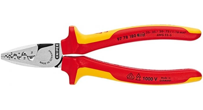 Voor het krimpen van adereindhulzen DIN 46228 deel 1 + 4 van 0,25 tot 16 mm²Lichte en slanke constructie. Krimping in gekenmerkte, half-ronde profielen voor en veilige verbinding van huls en ader. 9 bijzonder diepe profielen met conische zijvlakken. Speciaal gereedschapsstaal, gesmeed, in olie gehard. Knipex Adereindhulstang 0,25-16,0 mm VDE