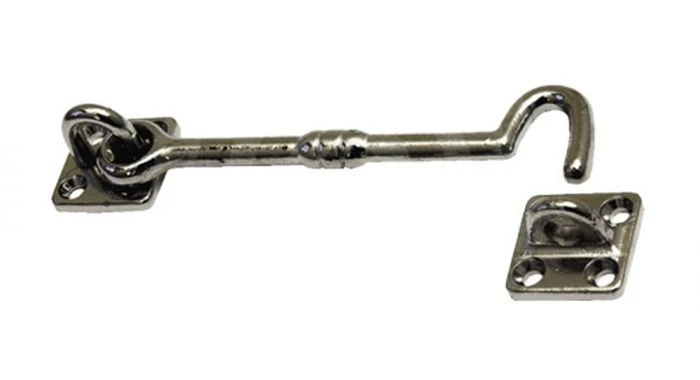 QlinQ® messing vernikkelde kajuithaak, voor het afsluiten van deuren, ramen, etc. Geschikt voor toepassing in de scheeps- en jachtbouw. Opschroevend model, met vierkante schroefplaten. Lengte 100 mm.