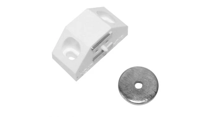 QlinQ® kunststof magneetsnapper, driehoekmodel met rond metalen sluitplaatje. Magneetsnappers worden gebruikt om deurtjes van keukenkasten en meubels vast te klikken en ander licht materiaal. Hoe groter en zwaarder het materiaal des te hoger de magneetkracht van de magneetsnapper dient te zijn. Opschroevend model, kleur wit, trekkracht 4 kg en verpakt per 2 stuks.