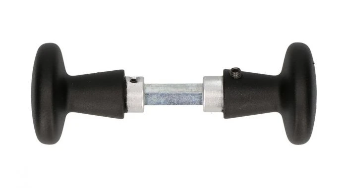 Aluminium zwart, knopkruk type 160. Set bestaande uit 2 knopkrukken en quickpuntschroef (boort zich in krukstift). Op blister.
