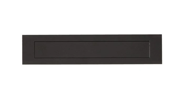 Briefplaat in aluminium zwart, met een naar binnen draaiende klep met veer. Op blister.