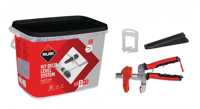 De set van het DELTA LEVEL SYSTEM van RUBI bestaat uit: 1 tang DELTA LS, die gebruikt kan worden voor zowel het horizontaal (voor vloeren) als verticaal (voor wanden) plaatsen van tegels, 1 zak met 100 clips DELTA LS, bestemd voor keramische tegels dikte tussen 3 mm. en 12 mm, en 1 zak met 100 stuks DELTA LS herbruikbare keggen. Alle onderdelen van het RUBI DELTA LEVEL SYSTEM zijn verpakt in een herbruikbare, praktische emmer met handgreep voor eenvoudig gebruik en transport.