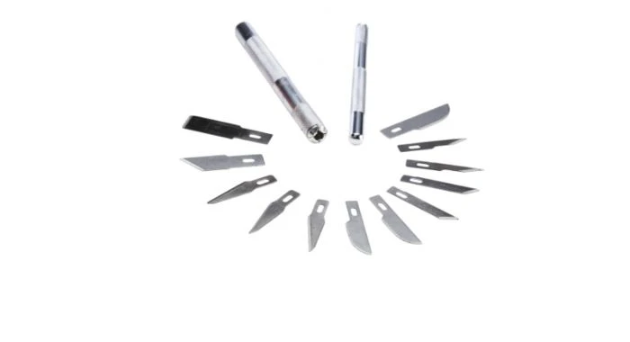 12 verschillende types bladen voor een uitgebreid gamma materialen en toepassingen, inclusief snijden met hoge precisie, ontbramen, inlegwerk, modelleren, sjabloneren en etsen