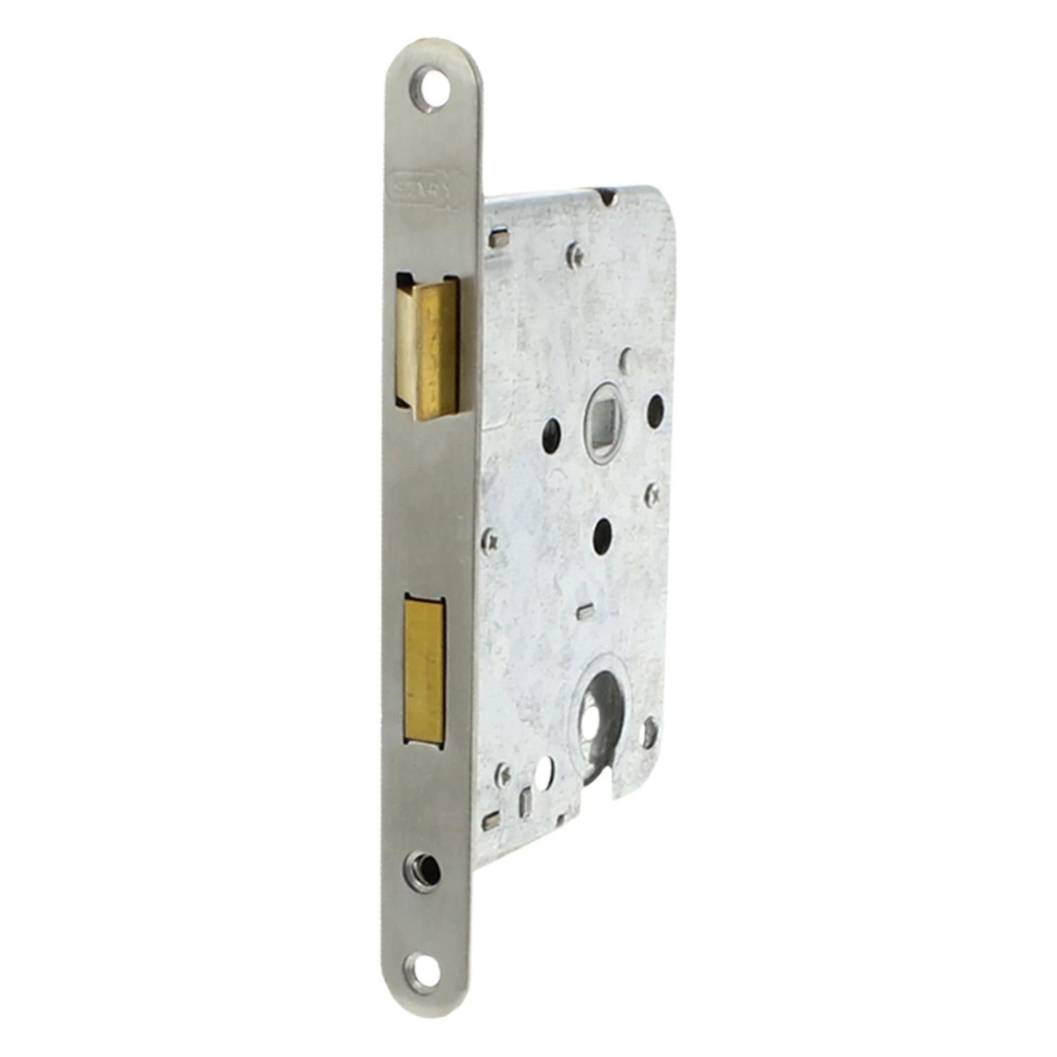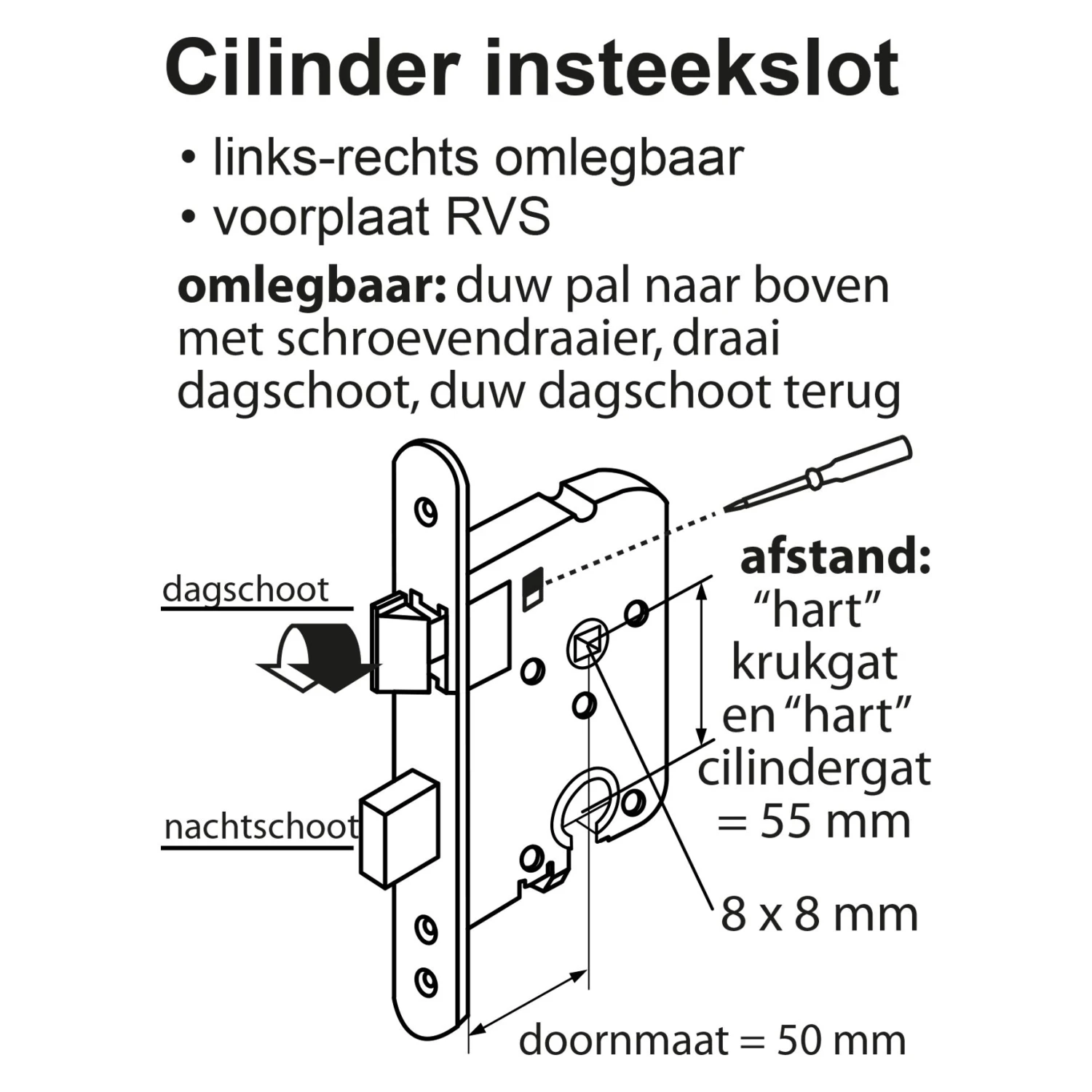 Cilinderslot. Rechts en links bruikbaar. Sluitplaat: vernikkeld. Voorplaat: RVS. Dagschoot: messing. Doornmaat: 50mm. Afstand krukgat/cilindergat: 55mm.