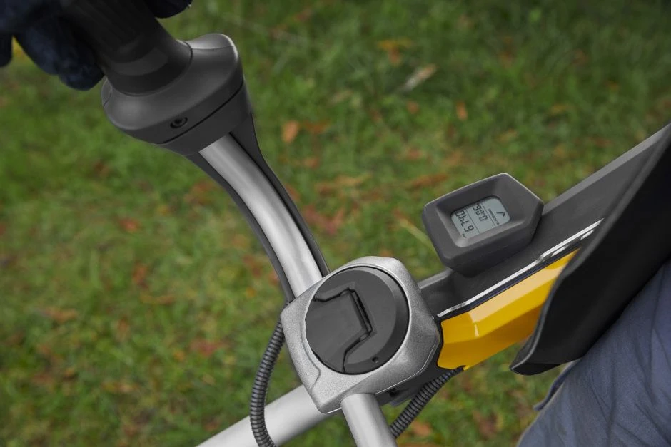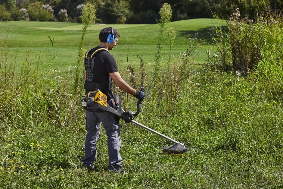 Bosmaaier aangedreven door een 52.8 cc tweetakt benzinemotor, rechte staal met versterkte steun, U-hendel en een maaibreedte van 45 cm.