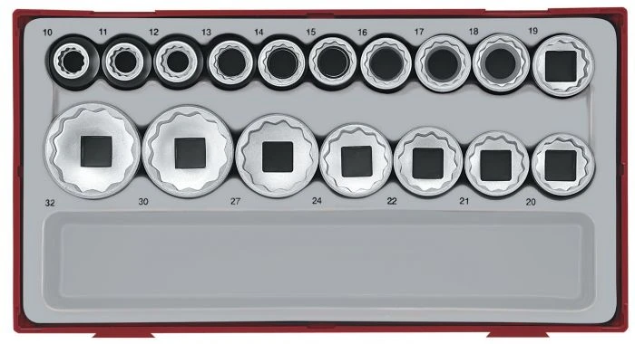 17x Dop – Twaalfkant – 1/2″: 10, 11, 12, 13, 14, 15, 16, 17, 18, 19, 20, 21, 22, 24, 27, 30 en 32 mm