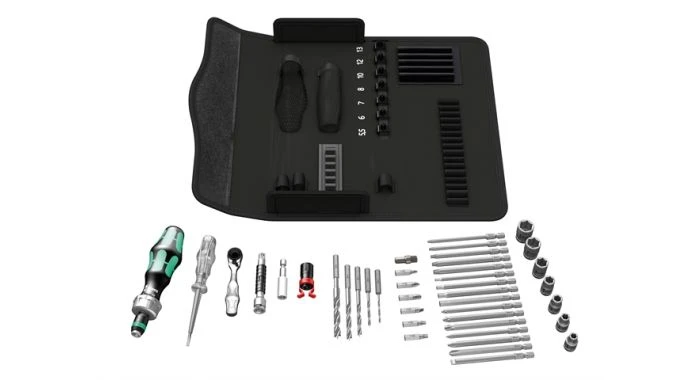 Compacte gereedschapset met de 41 belangrijkste schroefgereedschappen voor houtconstructiewerkzaamheden; met de robuuste 1/4″ bit-ratel Zyklop Mini met verlengstuk en dopadapter; 8 hand- en machinedoppen in de formaten 5,5-13; 1 ratelhandgreep 816 RA met ratelfunctie, fijne vertanding met kleine terughaalhoek, kartelwiel (rechts, vast, links), maximaal aanhaalmoment 50 Nm en bitopname met Rapidaptor-technologie; 1 universele bithouder; 6 bits, 25 mm lang; 16 bits, 89 mm lang; 5 houtspiraalboor bits met diameter 3-8 mm; 1 schroefklauw voor het vasthouden van schroeven; 1 spanningszoeker 247; rechtop te plaatsen voor overzichtelijke opslag in gereedschapsrek.