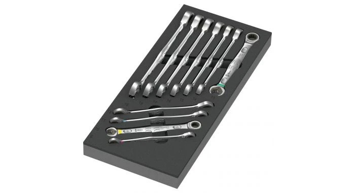 Duurzaam schuimrubberen inzetstuk; tweekleurig voor snelle identificatie van ontbrekende onderdelen; passend bij de Tool Rebel gereedschapswagen; voorzien van 11 Wera 6000 Joker ringratelsleutels.